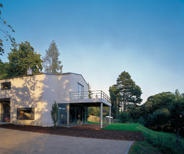 Das offene Erdgeschoss verzahnt sich durch seine großflächige Verglasung und die von innen nach aussen durchlaufende Höhenabstufung mit der Topographie des Grundstücks. Das geschlossene Volumen des Obergeschosses steht dazu im spannungsvollen Kontrast. Die geneigten Dachflächen bilden den zeltartigen Abschluss der Schlaf- und Arbeitsräume.