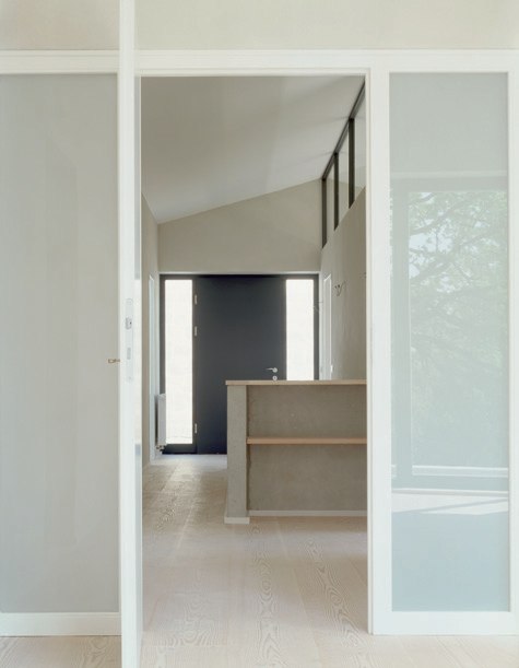 Sichtbeton, Sichtputz, Stahl, Glas, gekalkte Douglasie