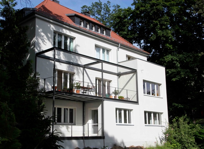 Eine neue Balkonanlage verbindet das Wohngeschoss über eine Aussentreppe mit dem tieferliegenden Garten.