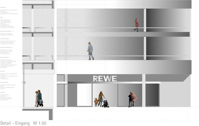 Zwischen Sockel und Attika ermöglicht eine eingespannte Metallgitter-Bekleidung die natürliche Belichtung und Belüftung der Parkebenen.