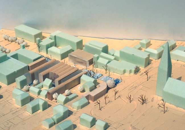 Die Rathauserweiterung überlagert das Prinzip der vorhandenen schmalen und tiefen Ost-West Parzellen mit einer Addition von Gebäude-segmenten, die sich straßenseitig zu einer geordneten Fassade zusammenschließen. Im Grundstücksinneren lösen sie sich in Einzelbaukörper auf und treten so in Dialog mit der städtischen Umgebung.