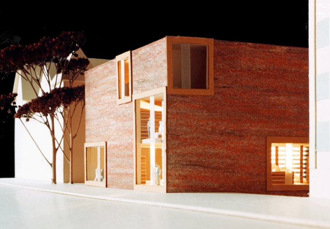 Die eher geschlossene städtische Außenseite wird durch große, frei verteilte Sichtöffnungen gegliedert.