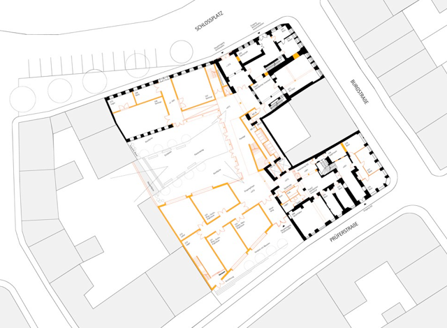 Durch die Schaffung eines neuen Eingangs zwischen den Häusern Schlossplatz 1 und 1a wird ein angemessener neuer Zugang geschaffen und ein markanter Akzent in der historischen Bausubstanz gesetzt.