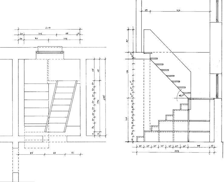 Diagonal den Raum kreuzend verbindet der zweite Treppenlauf das Podest mit dem oberen Antritt. Eine orange gefärbte Wand betont die Vertikalität des neuen Treppenraums.