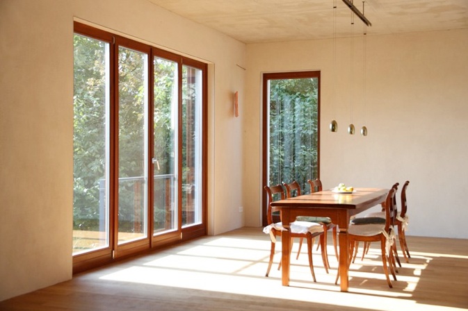 Lichtdurchfluteter Wohn-/Essbereich mit drei Meter Raumhöhe. Naturbelassene Materialien schaffen eine ausgewogene Farb- und Oberflächenkomposition.