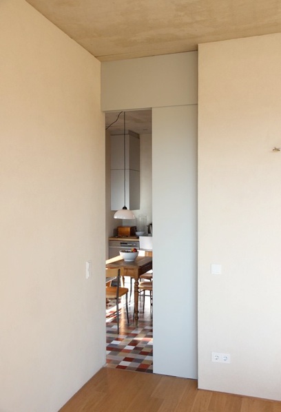 Rahmenlos eingebaute Schiebetür zwischen Essplatz und Küche