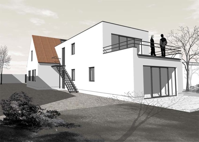 Eine Gebäudeerweiterung im rückwärtigen Gartenbereich enthält Behandlungs- und Nebenräume; eine Aussentreppe führt in die separat erschlossenen Wohnräume des Obergeschosses. Traditionelle und moderne Gestaltungselemente kamen bei dem Entwurf gleichermaßen zum Einsatz, um eine angemessene Antwort auf die Aufgabenstellung einer Bebauung inmitten der denkmalgeschützen baulichen Umgebung des alten Reicker Dorfkerns zu formulieren.