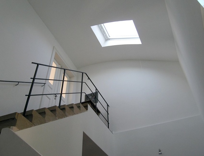 Die zweigeschossige Treppenhalle mit Oberlicht bildet ein helles und einladendes Entree