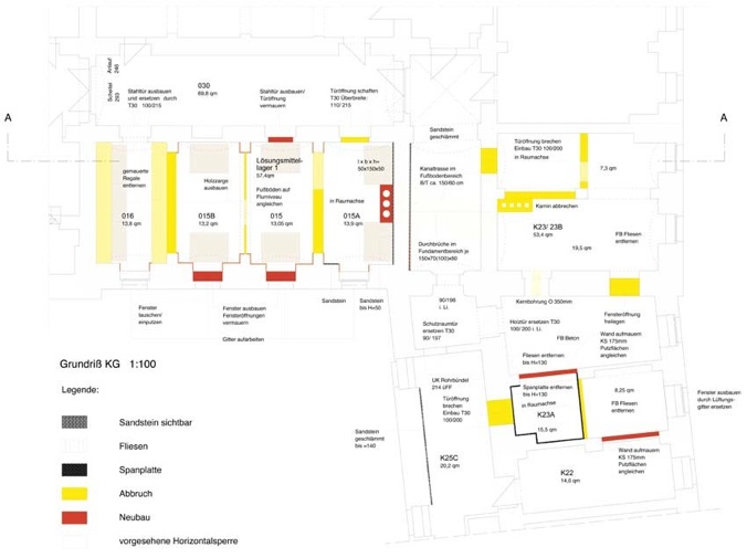Alle Räume erhielten eine nachträgliche Abdichtung gegen Erdfeuchte durch Injektionsvergelung. Die Fußböden wurden mit einem hochableitfähigem Epoxydharz-belag versehen. Die Sandstein-wände wurden bereichsweise von Putz befreit und gesandstrahlt oder mit einem neuen Sanierputz versehen. Die technischen Installationen umfassten Lüftungs- und Elektroanlagen, Beleuchtung und Notleuchten sowie spezielle Sicherheitsschränke für die Lagerware.