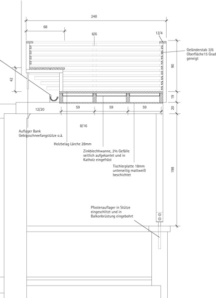 Im Dachbereich geht die Balkonkonstruktion in eine Sitzbank über