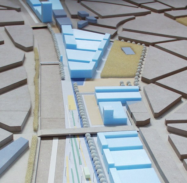 Entlang des Parks wird bandartig die Struktur der vorhandenen Stadtquartiere weiterentwickelt und im Bereich der vier Brücken-köpfe um markante Hochpunkte mit Sondernutzungen ergänzt. Fußgängerüberwege mit Anknüpfpunkten an den S-Bahn Haltepunkten schlagen die Brücke über die verbleibenden restlichen Bahntrassen.