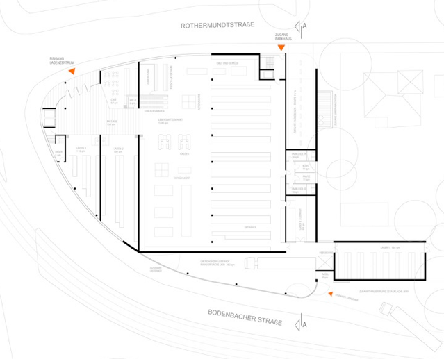 Das Gebäude wird fußläufig im Nordwesten über eine „offene Ecke“ erschlossen. Hier schließt sich eine gut einsehbare Mall an, die alle Ladenbereiche für den Kundenverkehr anbindet. Schiebe-/ Falttüranlagen erlauben eine großzügige Öffnung. Die Mall wird aufgrund der Außenanlage im Gebäude natürlich belichtet.