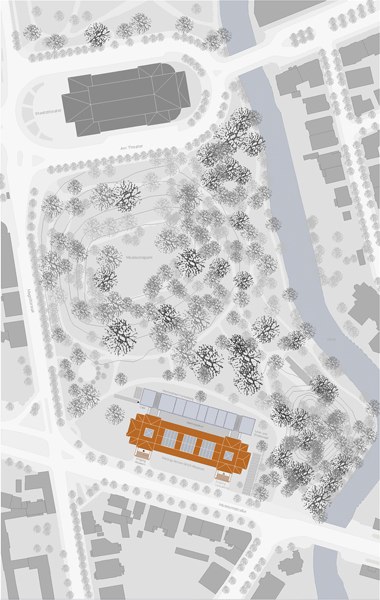 Das Herzog-Anton-Ulrich Museum in Braunschweig steht am Rande des "Museums-parks", dem Rudiment eines Landschaftsgartens aus dem frühen 19. Jahr-hundert. Der Gründerzeitbau erhält einen verglasten Anbau, der über Brücken mit dem Haupt-gebäude verbunden ist.