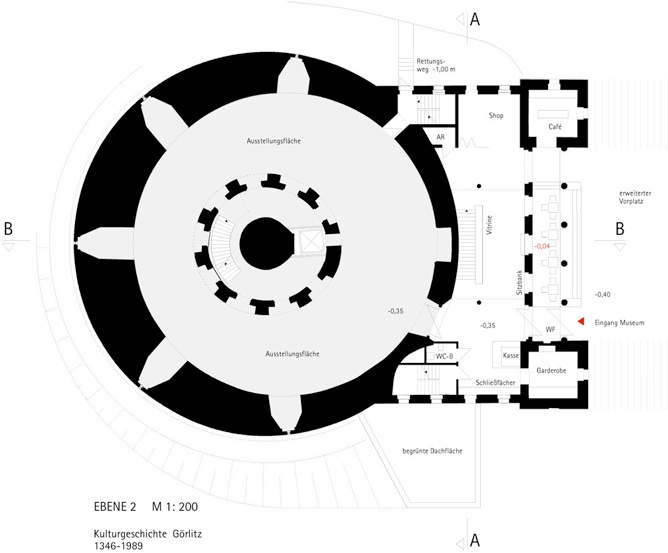 Die Absenkung des Eingangsbereiches auf die Höhe der Ebene 2, an Stelle der früheren Durchfahrt, ermöglicht die behindertengerechte Erschließung. Das Eingangs-podest bleibt erhalten und dient als Sitzplatzfläche für die Cafeteria.