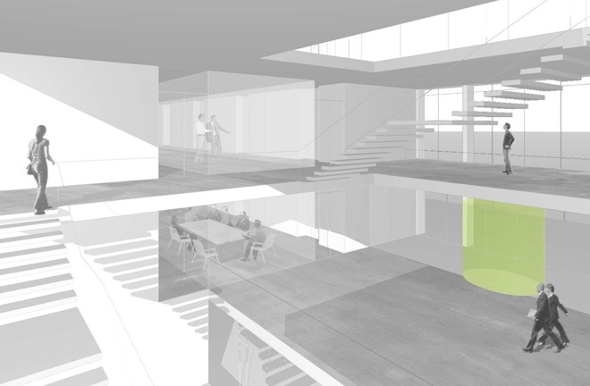 Zentrale Treppenhalle mit gläsernen Besprechungs-bereichen