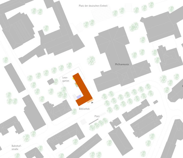 Um sich im Kontext der baulichen Nachbarschaft (Philharmonie) behaupten zu können, macht sich das Bibliotheksgebäude größer, als es eigentlich ist.