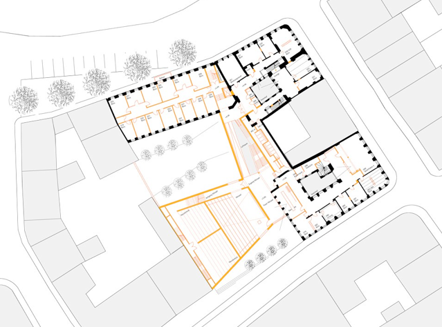 Der Zugang zu den zentralen Sanitärräumen erfolgt jeweils von den Gebäudebereichen des Schlossplatzes und der Prüferstraße. Durch das Auslagern der technischen Infrastruktur in den Neubaubereich können die baulichen Eingriffe in den Bestandsgebäuden minimiert werden.